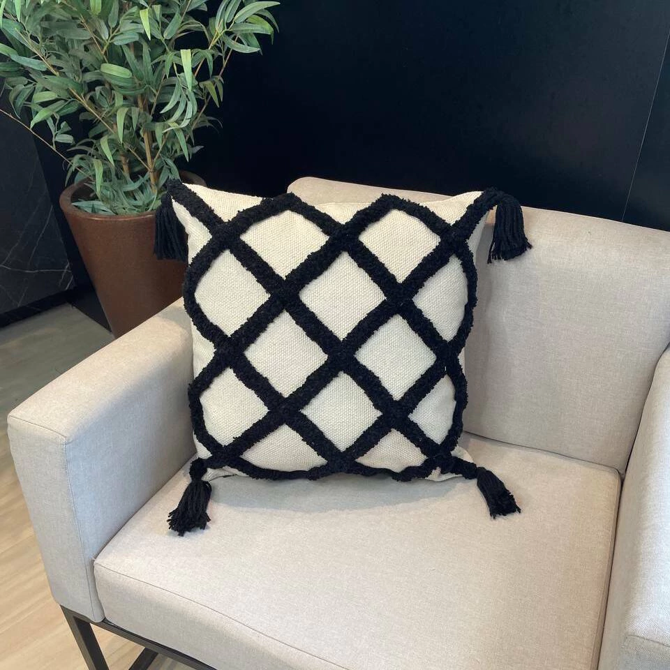 A Capa de Almofada Bordada Fiorella traz um design marcante com aplicação em relevo em formato de losangos e acabamento com tassels nos cantos, unindo sofisticação e descontração na medida certa.